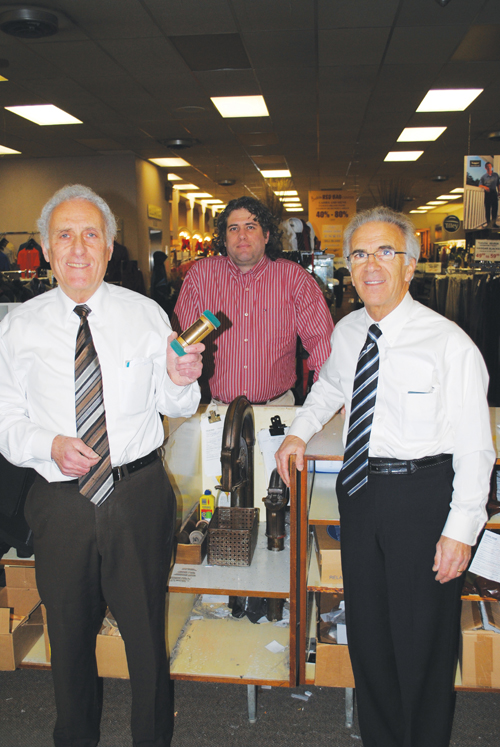 From left: Howie, Jeff and Stan Budd show the pneumatic tube system that was used as their cash registers in Budds department store. Now the tubes just deliver candy.