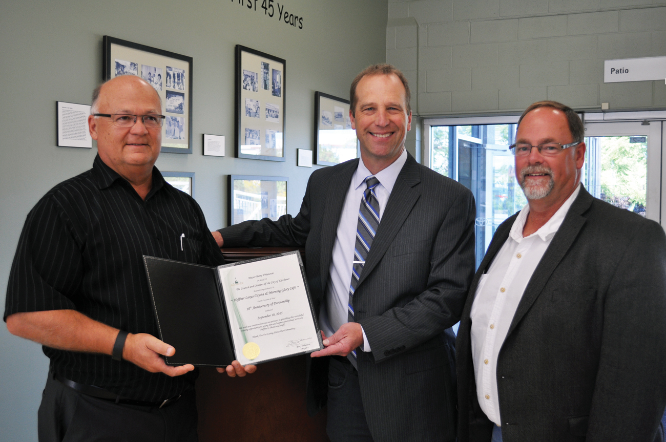 John Heffner (left) receives a certificate of congratulations from Kitchener Councillor Dave Schnider (middle) and Ray of Hope CEO Harry Whyte marking the 10th year of the unique partnership between Heffner Lexus-Toyota and the Ray of Hope Youth Employment Program’s Morning Glory Cafe, which is located inside the car dealership on King Street East in Kitchener.